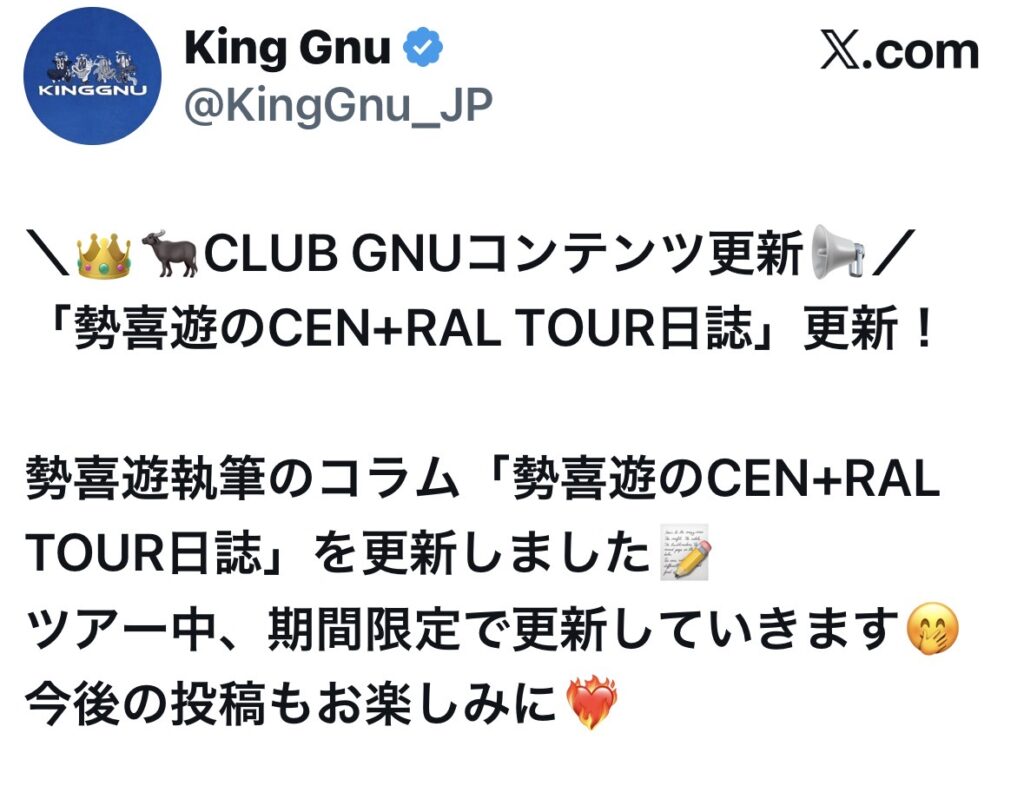 今回のタイトル。こんな感じでいいのか分かりませんが、King Gnuの話でもします。今ツアーはスマホ撮影OKということでSNSでその日のライブの情報を見ることができるようだ。なんか投稿内容が色々変わって面白い。